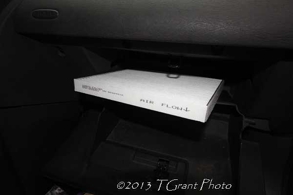Replacement of the air filter is an easy task, requiring no tools. To replace the filter carefully pop the left guide from the outer glove compartment door.