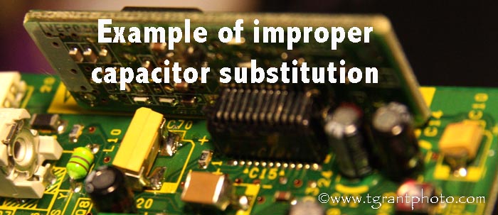 Unfortunately we've seen many dubious repair techniques. Some people take the easier method of using a conventional soldering iron to solder tubular or tantalum electrolytic capacitors above the circuit board. This might get the circuit working, but we feel that Panasonic used SMD capacitors for a specific purpose, the most important of which is to keep RF interference within the Y/C board as low as possible.