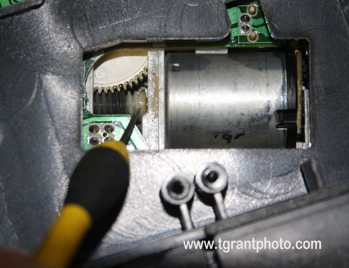 The thread/load motor has a small worm gear that drives the white plastic mechanism gear.