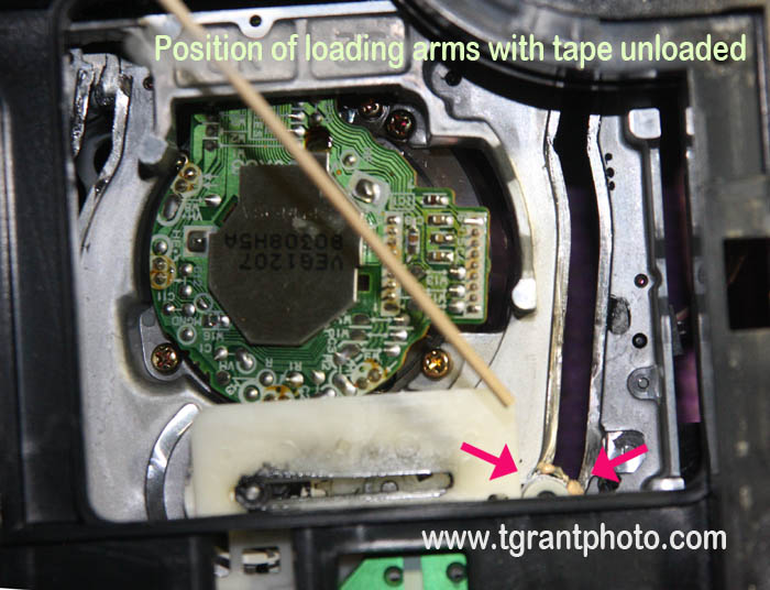 When the tape is unthreaded, the loading arms will be all the way at the bottom of the slot (see below)