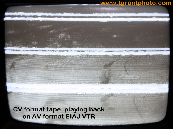 If you have an AV series VTR, such as the Sony AV-3650, a CV tape won't play back properly. The audio plays fine, but the picture looks like partially clogged video heads (photo below)