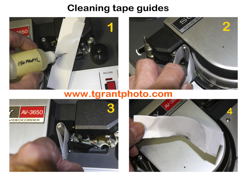 Cleaning the tape guides - Old tapes and "sticky tapes" will quickly place deposits on the tape guides and video head drum making playback impossible. You need to clean these frequently using 91% isopropyl alcohol. If a tape you have baked still sticks during playback, bake it again for another 8 hours following our instructions. Scrupulously clean the entire tape path. To clean hidden areas of the tape guides, cut a 1" x 6" piece of typing paper. Wet the typing paper with the isopropyl alcohol. Then wrap it around the main guides (see photos below) and work it back and forth to clean the stickiness from behind the tape guides. Allow 15 minutes for the alcohol to evaporate before playing the tape. You may have to repeat this process several times if the tape starts to stick again during playback. If the tape continues to stick, bake it again.