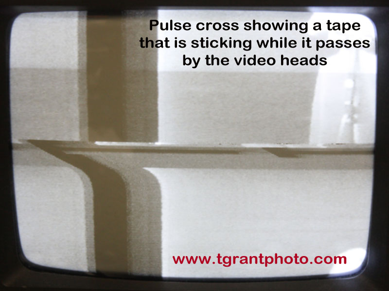 If the tape you are playing has sticky shed syndrome, the pulse cross will look quite abnormal since the tape is dragging as it passes through the tape path. The pulse cross will bend to the left (see photo below) Unlike the above playback example, the skew control cannot correct for sticky tape error. The best solution is always to try baking the tape.