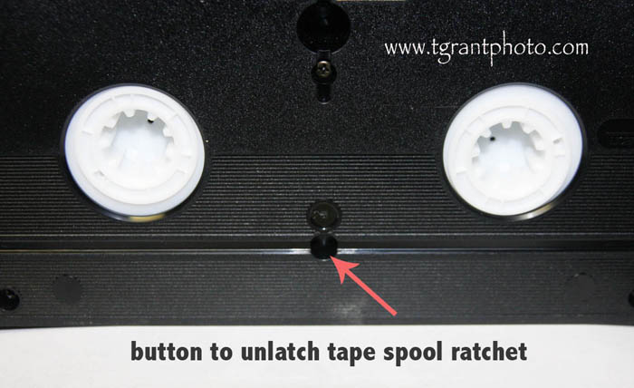 The first thing to check is the back tension of the VHS cassette. Remove the VHS cassette from the machine. Press the button on the side of the cassette and open the front flap of the VHS cassette. Tip: The button may be black colored, making it harder to spot!