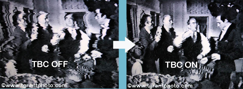 The above image was played back on a JVC SR V10u. The VHS tape was a second generation dupe, copied from an old Sony CV-2200 reel-ro-reel VCR. On the right, you see the corrected image when the VCR's TBC is turned "on". Although the corrected picture isn't perfect, it's certainly an improvement over the original!