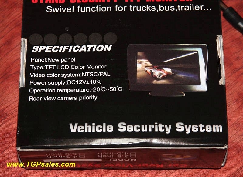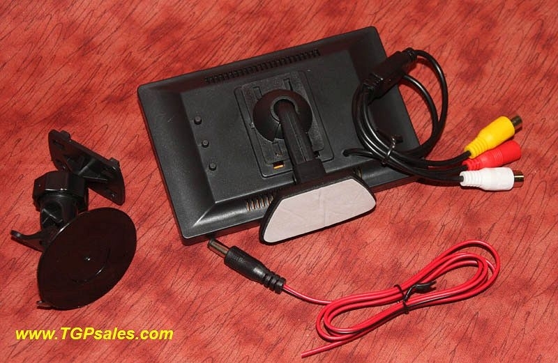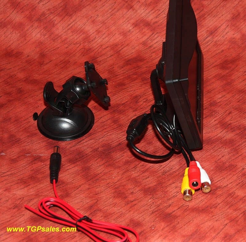 This monitor includes: 2.1mm cable for connection to your 12vdc source; monitor mounts ~ suction monitor mount and screw-type mount.  Does not include power supply. You can use a 12vdc 400ma power supply (available from us separately)