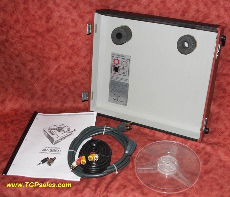 Included in this sale: A.C. power cable; PL259 to RCA adapter (for video output); mini-plug to RCA adapter (for audio output); triple RCA cable; 7" dia. takeup reel, pre-recorded demo tape. The original instructions are not available, however we're including a reprint of the very similar Sony AV-3650 instruction booklet.